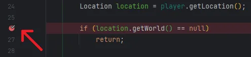 if (location.getWorld().getEnvironment() == World.Environment.NETHER) { player.sendMessage("You are in the nether!"); }}You can add a breakpoint to the line by clicking on the line number: